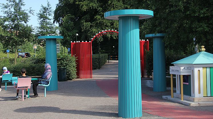 Möbler ur och Parcoserien och affischpelaren Bill Post i härliga pastellfärger syns nu i Malmös nya teaterlekplats i Pildammsparken. Vid entrén och inne i lekparken finns flera grupper med fastmonterade stolar, fåtöljer, bord och barnstolar liksom affischpelare. Just sittplatser har man varit generös med vid utformandet av parken. Broberg & Ridderstråle har formgivit möblerna för Nola.