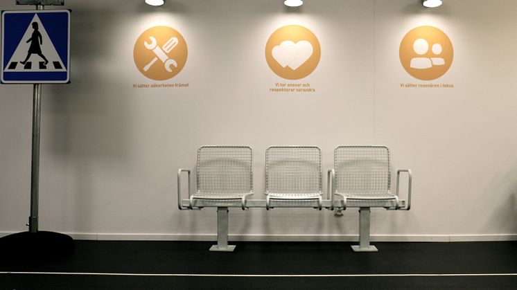 På Keolis huvudkontor har skapats utemiljöer inomhus i form av potentiella busshållplatser. Solliden soffa, i Björn Dahlströms design fungerar utmärkt på väntplatser såväl utomhus som inomhus. För inredningen står Codesign arkitektbyrå.