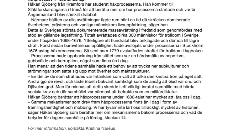 Håkan Sjöberg kommer till Släktforskardagarna i Umeå för att berätta mer om häxprocesserna i Ångermanland där närmare hälften av landets alla dömda för trolldom avrättades.
