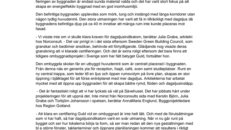 - Det är fantastiskt roligt att vi har lyckats så väl på Sävehuset. Det har jobbats hårt under projekteringen för att uppnå det. Inte minst från Norconsults sida med Kerstin Björn, Julia Grabe och Torbjörn Johansson i spetsen, berättar AnnaMaria Englund, Byggprojektledare hos Region Gotland.