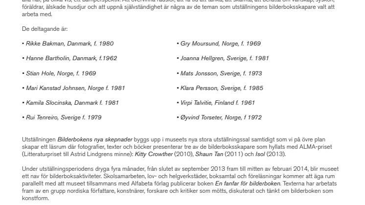 På medföljande PDF presenteras utställningens bilderboksskapare med var sin porträttbild och ett bildexempel från en av hans/ hennes böcker.