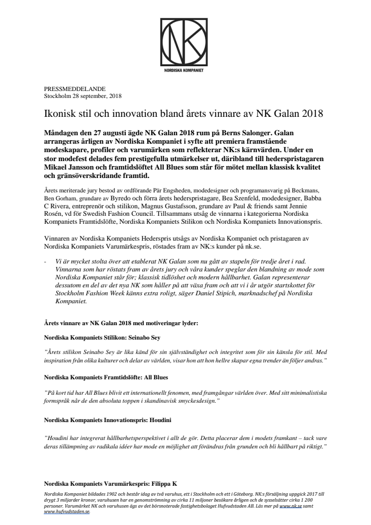 Måndagen den 27 augusti ägde NK Galan 2018 rum på Berns Salonger. Galan arrangeras årligen av Nordiska Kompaniet i syfte att premiera framstående modeskapare, profiler och varumärken som reflekterar NK:s kärnvärden.