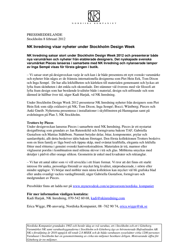 NK Inredning satsar stort under Stockholm Design Week 2012 och presenterar både nya varumärken och nyheter från etablerade designers. Det nyskapade svenska varumärket Pieces lanseras i samarbete med NK Inredning och nylanserade lampor av Inga Sempé visas för första gången i butik.