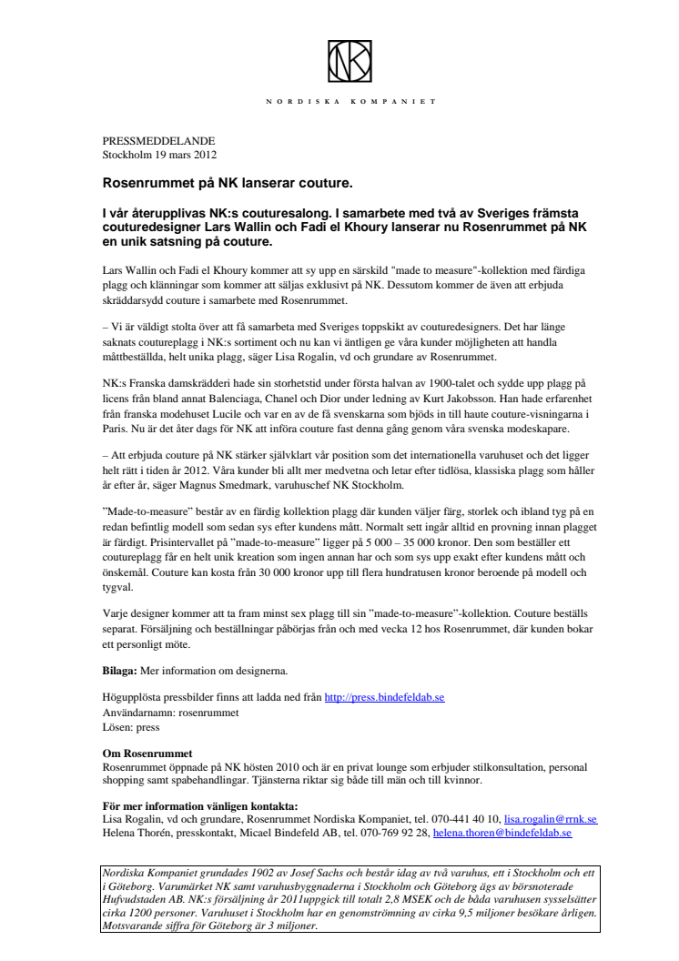 I vår återupplivas NK:s couturesalong. I samarbete med två av Sveriges främsta couturedesigner Lars Wallin och Fadi el Khoury lanserar nu Rosenrummet på NK en unik satsning på couture.