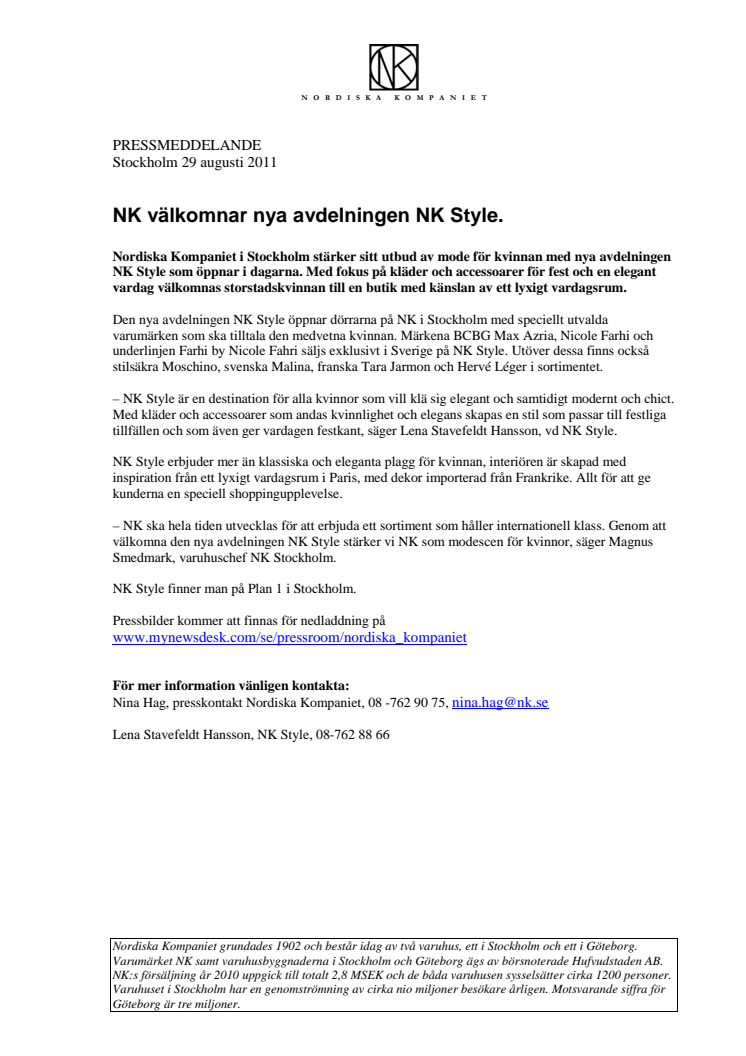 Nina Hag, presskontakt Nordiska Kompaniet, 08 -762 90 75, nina.hag@nk.se