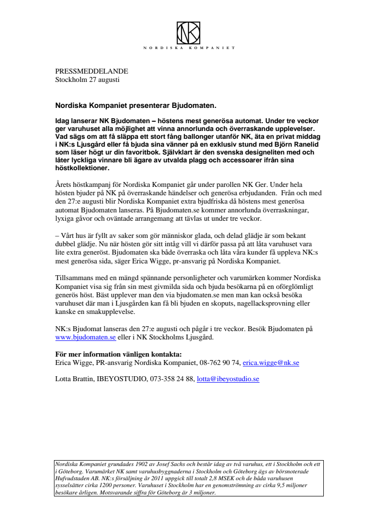 Årets höstkampanj för Nordiska Kompaniet går under parollen NK Ger. Under hela hösten bjuder på NK på överraskande händelser och generösa erbjudanden. Från och med den 27:e augusti blir Nordiska Kompaniet extra bjudfriska då höstens mest generösa automat Bjudomaten lanseras. På Bjudomaten.se kommer annorlunda överraskningar, lyxiga gåvor och oväntade arrangemang att tävlas ut under tre veckor.