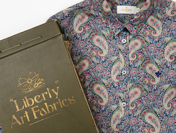 Blus i paisleymönstrat Libertytyg och mönsterprover från Liberty & co ur utställningen British så in i Norden på Nordiska museet.