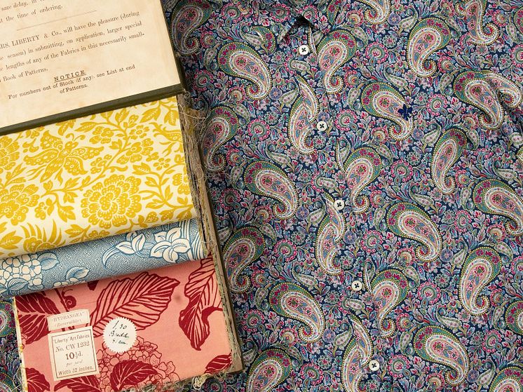 Blus i paisleymönstrat Libertytyg och mönsterprover från Liberty & co ur utställningen British så in i Norden på Nordiska museet.