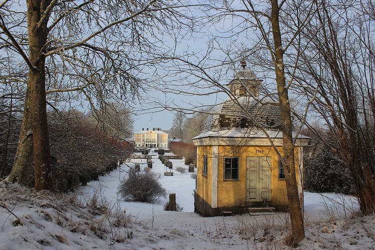 Lusthuset och huvudbyggnaden på Julita gård. Bild på sida 15 i antologin Julita gård – Människor och landskap under tusen år.