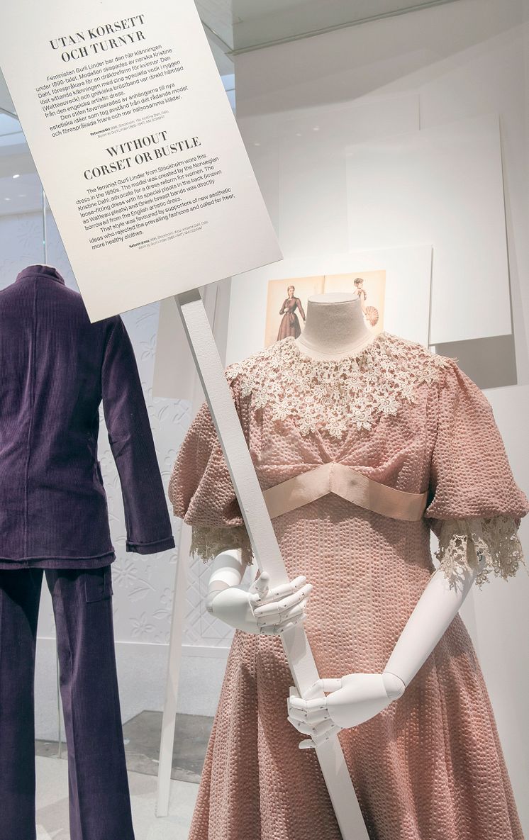 Manchesterkostym och reformdräkt ur utställningen British så in i Norden på Nordiska museet.