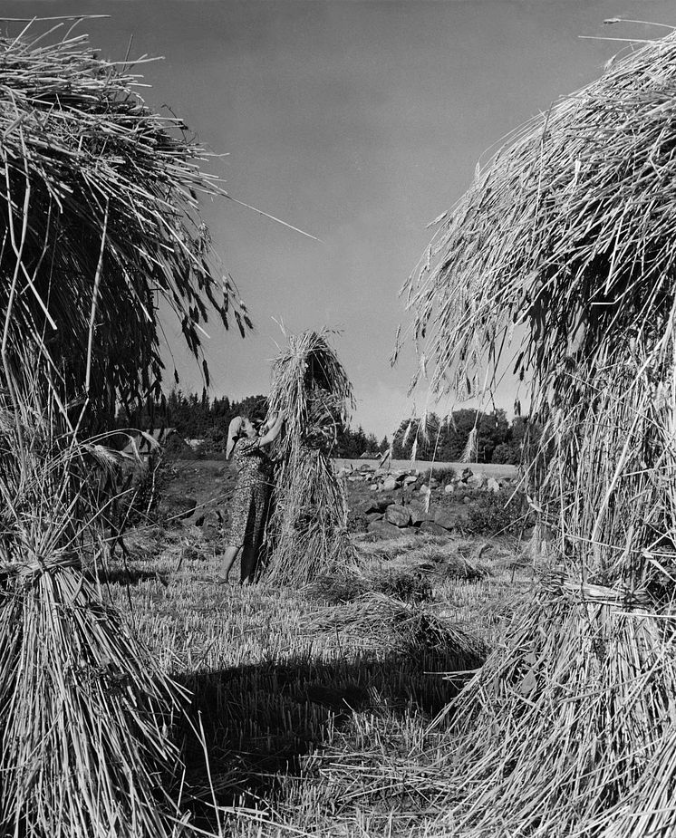 Produktionen av spannmål har präglat arbetsåret och livsmedelsförsörjningen i tusentals år. Dädesjö socken, Småland 1953. Foto: Erik Liljeroth, © Nordiska museet.