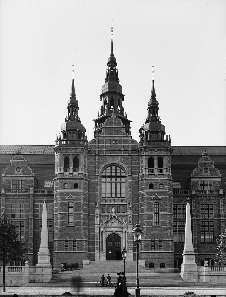 Nordiska museets fasad; mittparti och huvudentré med de två obeliskerna vid trappan upp mot museibyggnaden. I förgrunden ses människor promenera.