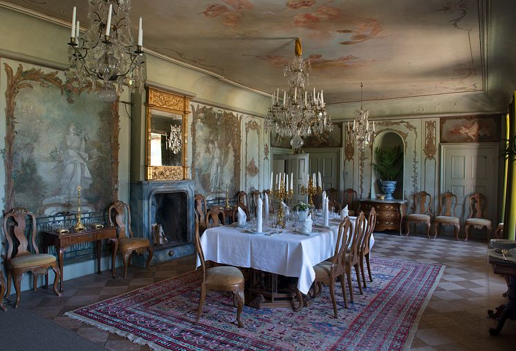 Stora matsalen med framtaget väggmåleri från rokokotiden