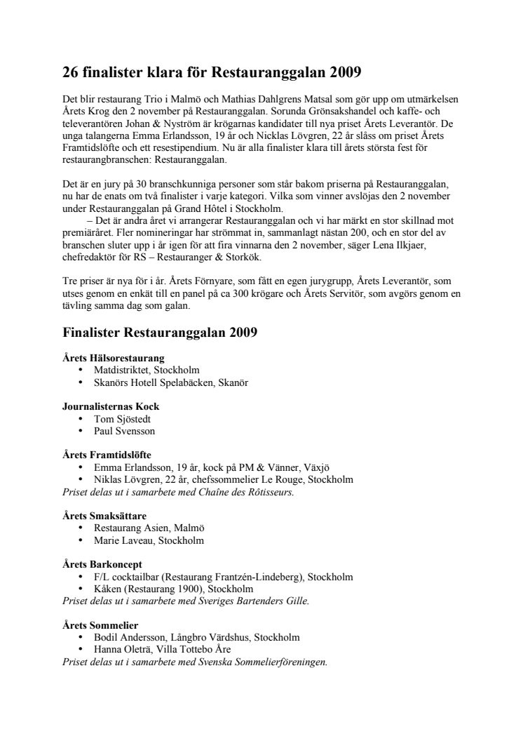 Nu är finalisterna klara till årets upplaga av Restauranggalan. Det blir Restaurang Trio i Malmö och Mathias Dahlgren Matsalen i Stockholm som slåss om priset Årets Krog. Nominerade till Årets Krögare är Per Bengtsson, PM & Vänner och Magnus Lindström & Per Blomqvist på Swedish Taste, Göteborg.