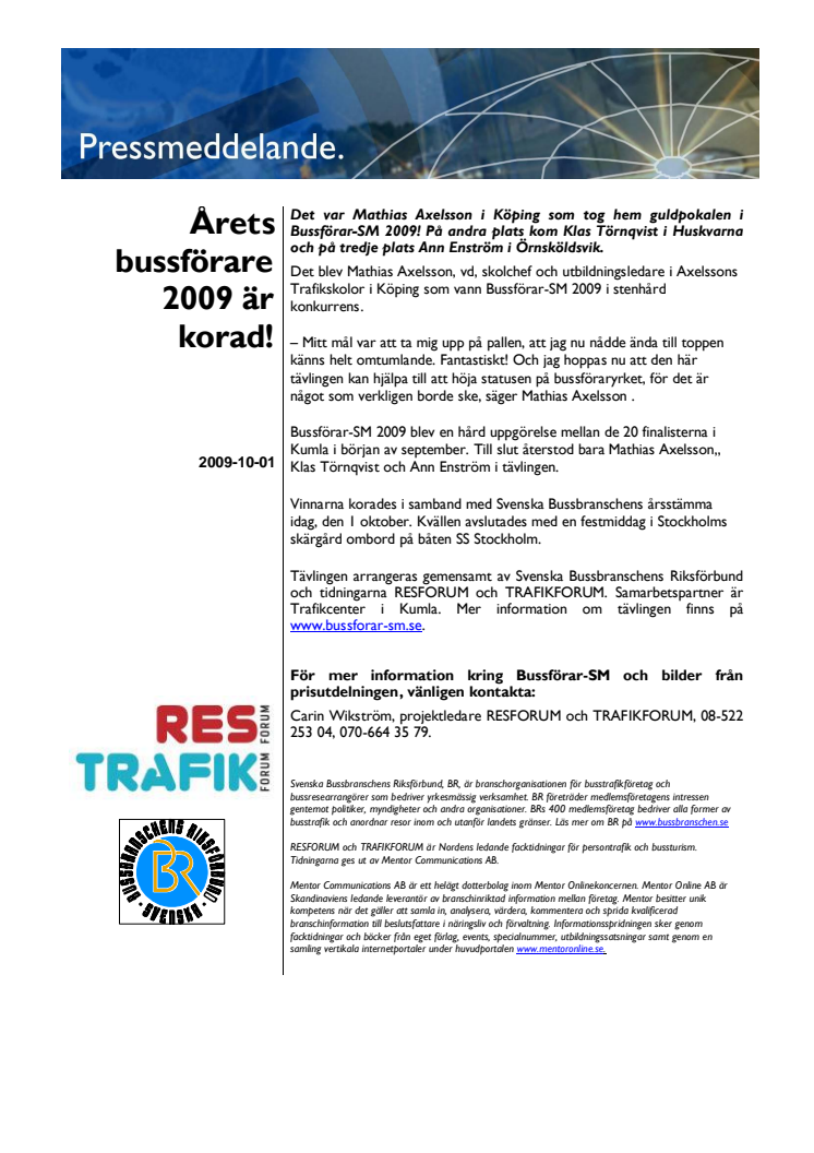 Det var Mathias Axelsson i Köping som tog hem guldpokalen i Bussförar-SM 2009! På andra plats kom Klas Törnqvist i Huskvarna och på tredje plats Ann Enström i Örnsköldsvik.