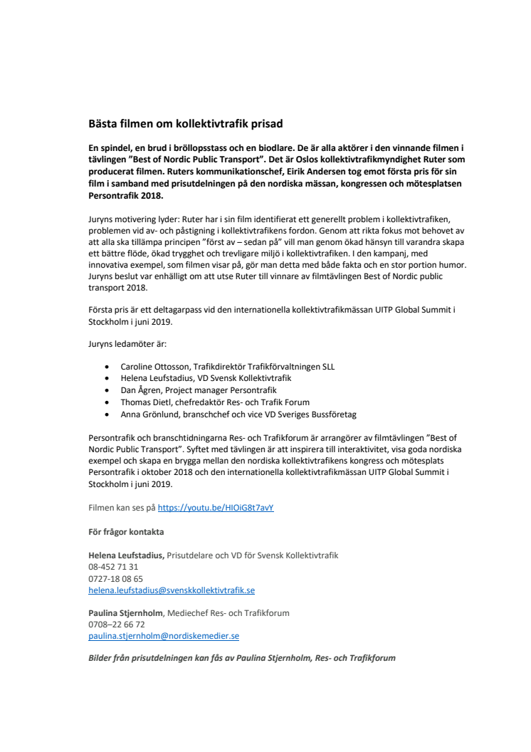 En spindel, en brud i bröllopsstass och en biodlare. De är alla aktörer i den vinnande filmen i tävlingen ”Best of Nordic Public Transport”. Det är Oslos kollektivtrafikmyndighet Ruter som producerat filmen. Ruters kommunikationschef, Eirik Andersen tog emot första pris för sin film i samband med prisutdelningen på den nordiska mässan, kongressen och mötesplatsen Persontrafik 2018.