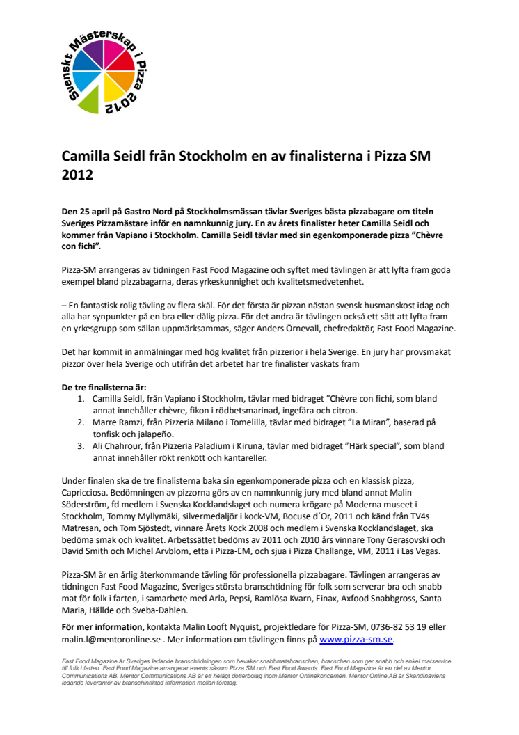Den 25 april på Gastro Nord på Stockholmsmässan tävlar Sveriges bästa pizzabagare om titeln Sveriges Pizzamästare inför en namnkunnig jury. En av årets finalister heter Camilla Seidl och kommer från Vapiano i Stockholm. Camilla Seidl tävlar med sin egenkomponerade pizza ”Chèvre con fichi”.