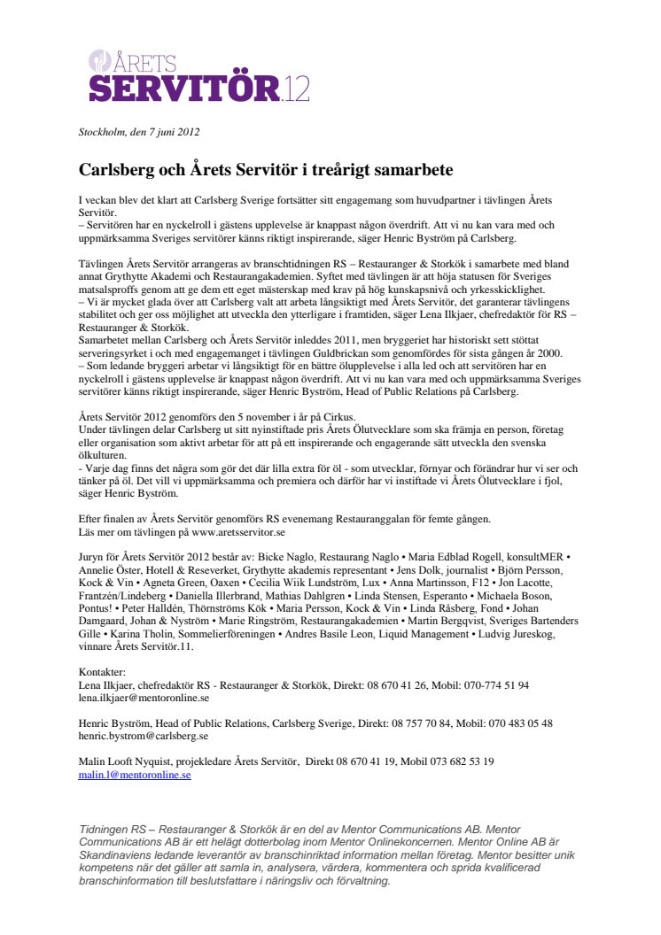 I veckan blev det klart att Carlsberg Sverige forsätter med sitt engagemang som huvudpartner i tävlngen Årets Servitor. Tävlingen Årets Servitör arrangeras av branschtidningen RS – Restauranger & Storkök i samarbete med bland annat Grythytte Akademi och Restaurangakademien. Syftet med tävlingen är att höja statusen för Sveriges matsalsproffs med ledorden modernt medvetet värdskap.