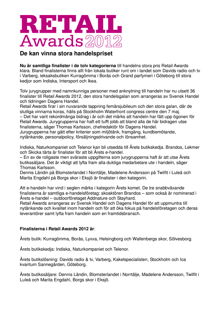 Nu är samtliga finalister i de tolv kategorierna till handelns stora pris Retail Awards klara. Bland finalisterna finns allt från lokala butiker runt om i landet som Davids radio och tv i Varberg, leksaksbutiken Kurragömma i Borås och Grand parfymeri i Göteborg till stora kedjor som Indiska, Intersport och Ikea. Läs om alla finalisterna här!
