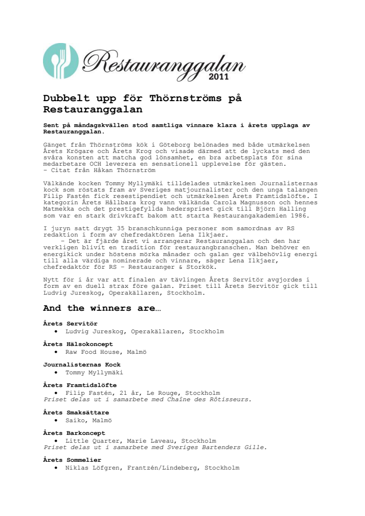 Sent på måndagskvällen stod samtliga vinnare klara i årets upplaga av Restauranggalan på Grand Hôtel i Stockholm. Gänget från Thörnströms kök i Göteborg belönades med båda utmörkelsen Årets Krögare och Årets Krog.