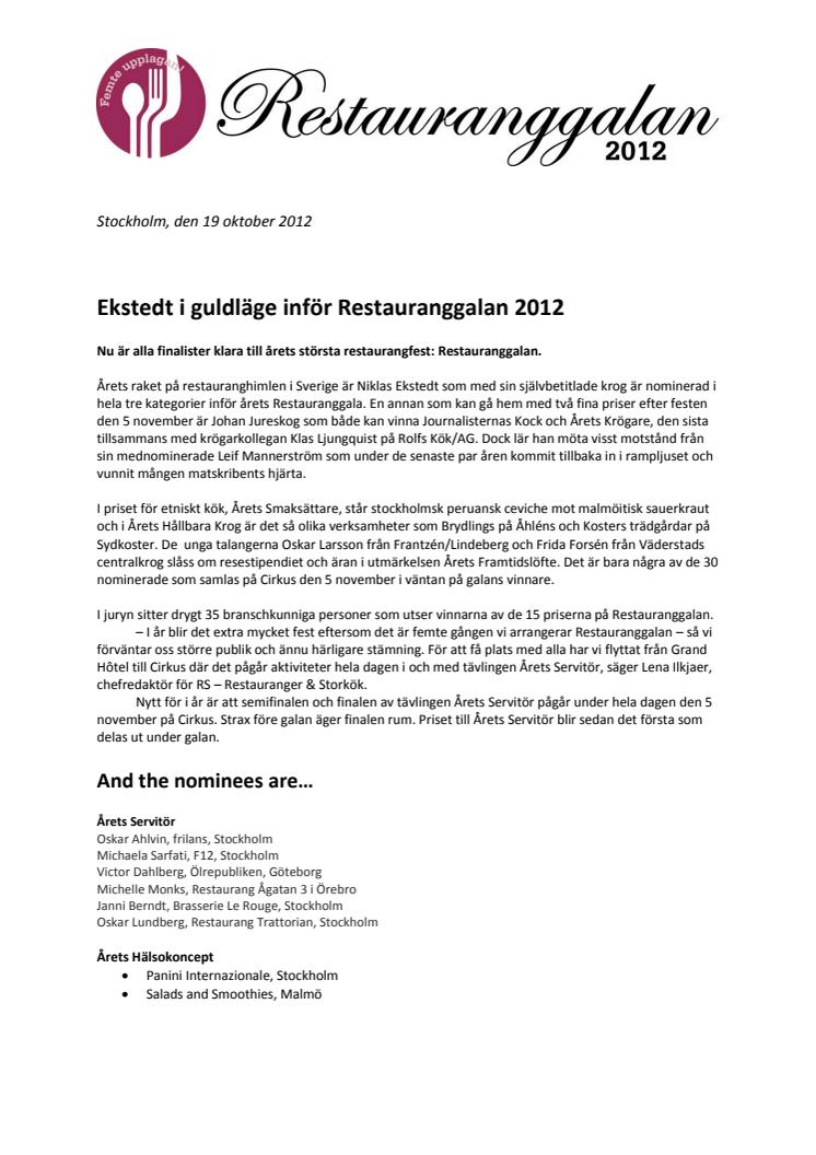 Nu är alla 28 finalister i 14 kategorier klara till årets största restaurangfest: Restauranggalan. Årets raket på restauranghimlen i Sverige är Niklas Ekstedt som är nominerad i hela tre kategorier. En annan som kan gå hem med två fina priser är Johan Jureskog. Johan Jureskog lär möta visst motstånd från sin mednominerade Leif Mannerström. Restauranggalan äger rum 5 november på Cirkus i Stockholm.
