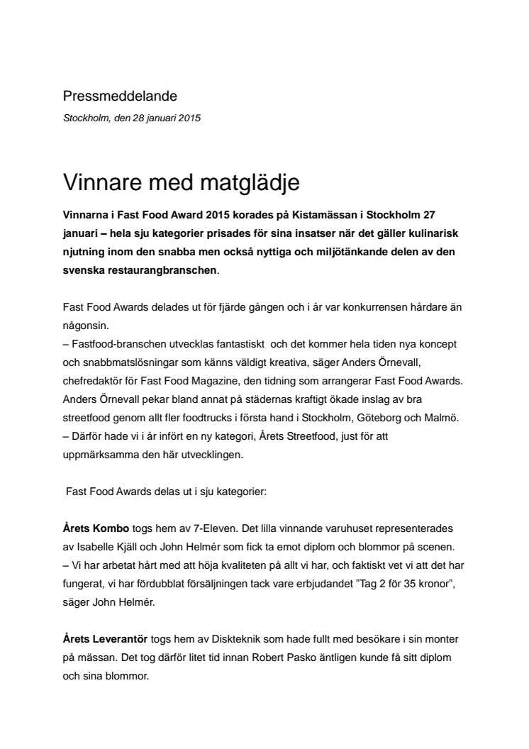 Vinnarna i Fast Food Award 2015 korades på Kistamässan i Stockholm 27 januari – hela sju kategorier prisades för sina insatser när det gäller kulinarisk njutning inom den snabba men också nyttiga och miljötänkande delen av den svenska restaurangbranschen. Fast Food Awards delades ut för fjärde gången och i år var konkurrensen hårdare än någonsin.