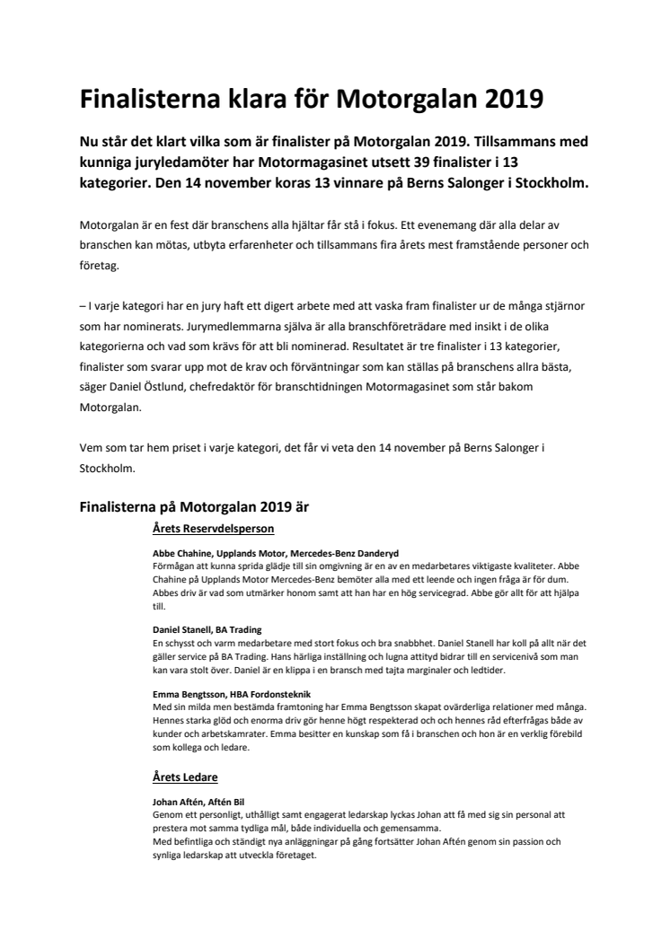 Nu står det klart vilka som är finalister på Motorgalan 2019. Tillsammans med kunniga juryledamöter har Motormagasinet utsett 39 finalister i 13 kategorier. Den 14 november koras 13 vinnare på Berns Salonger i Stockholm.