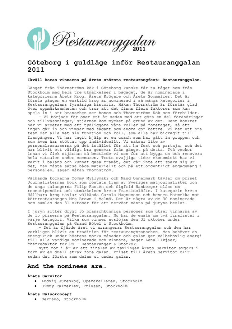 Ikväll koras vinnarna på årets största restaurangfest: Restauranggalan. Restauranggalan äger rum i Vinterträdgården på Grand Hôtel i Stockholm. Tävlingen har 14 kategorier och nytt för i år är att duellen mellan finalisterna i Årets Servitör äger rum vid drinken ca kl 18.