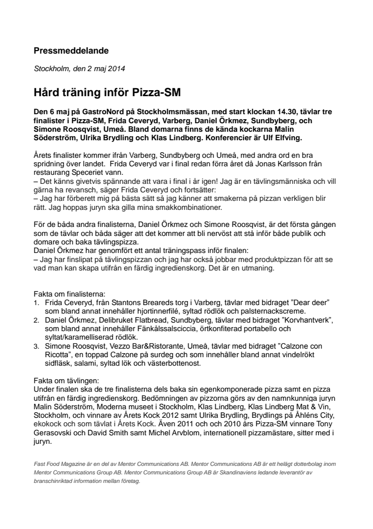 Den 6 maj på GastroNord på Stockholmsmässan, med start klockan 14.30, tävlar tre finalister i Pizza-SM, Frida Ceveryd, Varberg, Daniel Örkmez, Sundbyberg, och Simone Roosqvist, Umeå. Bland domarna finns de kända kockarna Malin Söderström, Ulrika Brydling och Klas Lindberg. Konferencier är Ulf Elfving. Pizza-SM är en tävling för professionella pizzabagare och arrangeras av Fast Food Magazine.