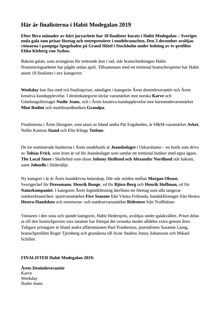 Här är de 18 finalisterna i Habit Modegalan – Sveriges enda gala som prisar företag och entreprenörer i modebranschen. För 13:e året i rad arrangeras galan av branschtidningen Habit Sko & Mode. Det är 7 kategorier på årets gala, finalisterna har utsetts tillsammans med ett 30-tal branschexperter. I kategorin Habit Hederspris finns inga finalister, där avslöjas vinnaren direkt på galan.