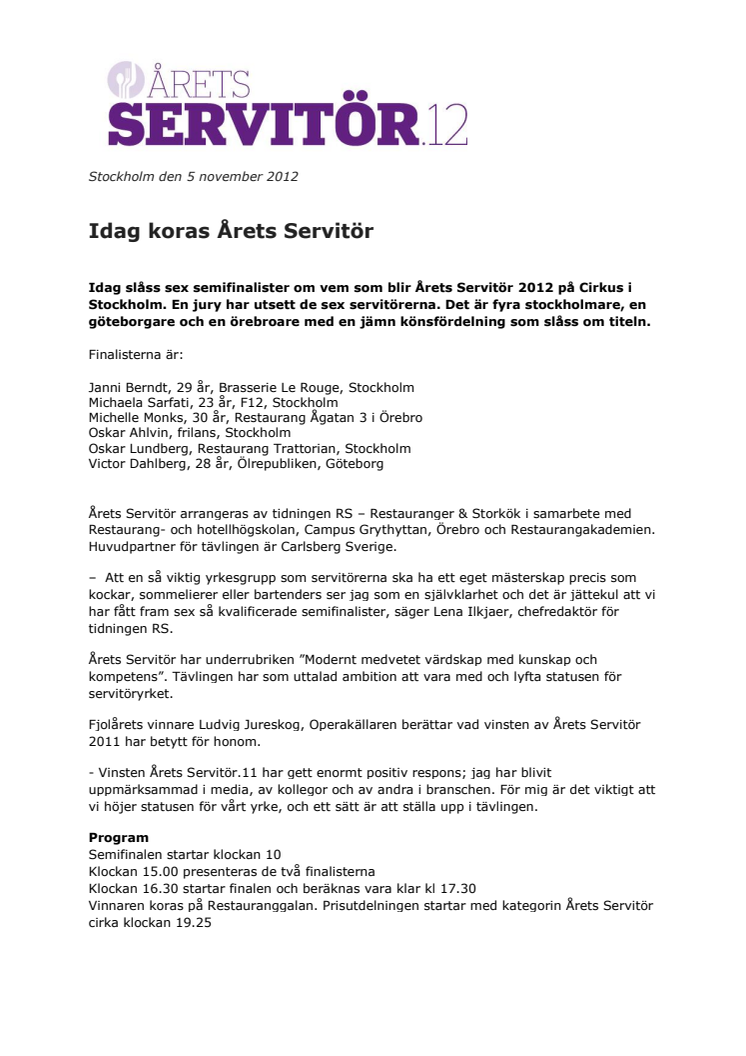 Idag slåss sex semifinalister om vem som blir Årets Servitör 2012 på Cirkus i Stockholm. En jury har utsett de sex servitörerna. Det är fyra stockholmare, en göteborgare och en örebroare med en jämn könsfördelning som slåss om titeln.
