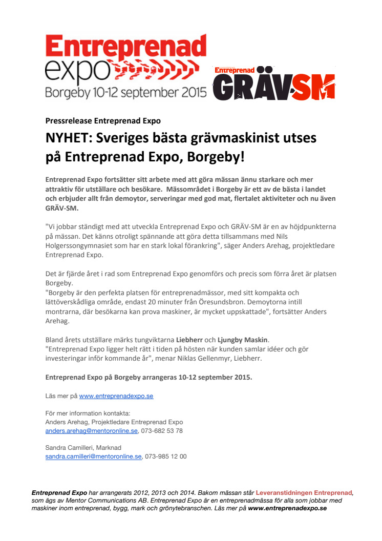 Entreprenad Expo fortsätter sitt arbete med att göra mässan ännu starkare och mer attraktiv för utställare och besökare. Mässområdet i Borgeby är ett av de bästa i landet och erbjuder allt från demoytor, serveringar med god mat, flertalet aktiviteter och nu även GRÄV-SM.
