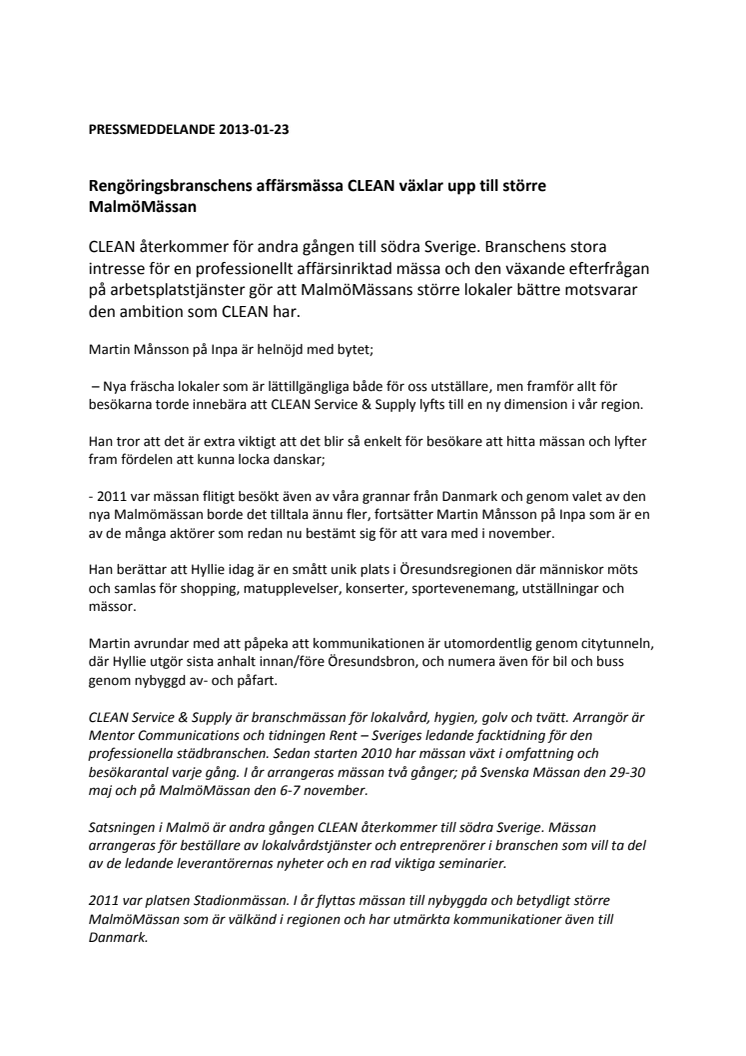 Branschens stora intresse för en professionellt affärsinriktad mässa och den växande efterfrågan på arbetsplatstjänster gör att MalmöMässans större lokaler bättre motsvarar den ambition som CLEAN har.