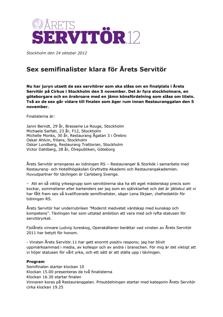 Nu har juryn utsett de sex servitörer som ska slåss om en finalplats i Årets Servitör på Cirkus i Stockholm den 5 november. Det är fyra stockholmare, en göteborgare och en örebroare med en jämn könsfördelning som slåss om titeln. Två av de sex går vidare till finalen som äger rum innan Restauranggalan den 5 november. Årets Servitör arrrangeras för tredje gången och av RS (Restaurang & Storkök).