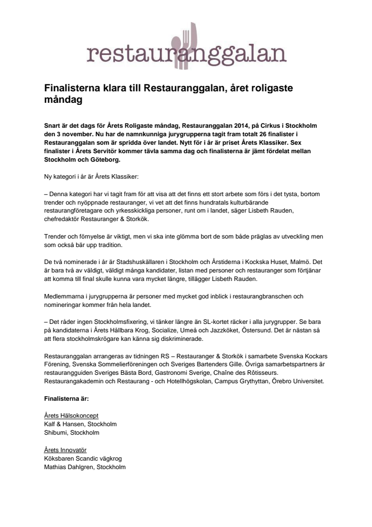 Vinnare i Restauranggalan 2014 korades i går. Det skedde med en stor branschfest med cirka 500 gäster på Cirkus i Stockholm. Priser delades ut i 14 olika kategorier. Vinnare var bland annat Mathias Dahlgren, Malin Söderström, Patrick Strömsten, Jazzköket i Östersund och Koka i Göteborg.