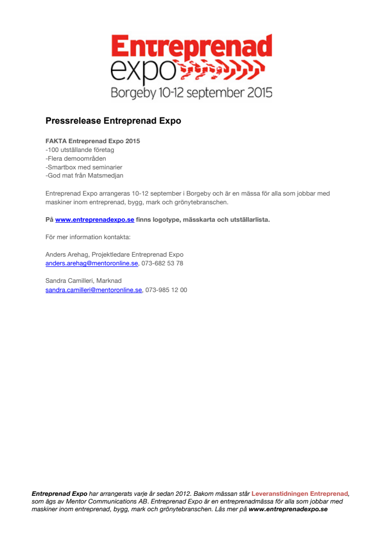 Entreprenad Expo arrangeras 10-12 september i Borgeby och är en mässa för alla som jobbar med maskiner inom entreprenad, bygg, mark och grönytebranschen.