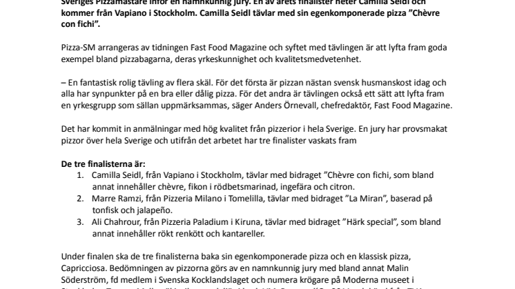 Det har kommit in anmälningar med hög kvalitet från pizzerior i hela Sverige. En jury har provsmakat pizzor över hela Sverige och utifrån det arbetet har tre finalister vaskats fram
