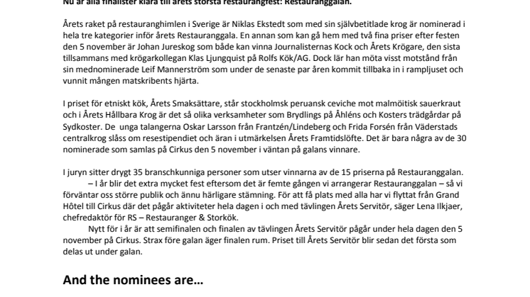 Årets raket på restauranghimlen i Sverige är Niklas Ekstedt som med sin självbetitlade krog är nominerad i hela tre kategorier inför årets Restauranggala. En annan som kan gå hem med två fina priser efter festen den 5 november är Johan Jureskog som både kan vinna Journalisternas Kock och Årets Krögare, den sista tillsammans med krögarkollegan Klas Ljungquist på Rolfs Kök/AG. Dock lär han möta visst motstånd från sin mednominerade Leif Mannerström som under de senaste par åren kommit tillbaka in i rampljuset och vunnit mången matskribents hjärta.