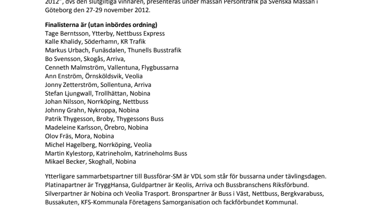 Utifrån resultatet av dessa olika prov avgörs vilka tre bussförare som kommer på första, andra respektive tredje plats i Bussförar-SM 2012. Vem som slutligen får titulera sig ”Årets Bussförare 2012”, dvs den slutgiltiga vinnaren, presenteras under mässan Persontrafik på Svenska Mässan i Göteborg den 27-29 november 2012.