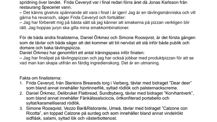Den 6 maj på GastroNord på Stockholmsmässan, med start klockan 14.30, tävlar tre finalister i Pizza-SM, Frida Ceveryd, Varberg, Daniel Örkmez, Sundbyberg, och Simone Roosqvist, Umeå. Bland domarna finns de kända kockarna Malin Söderström, Ulrika Brydling och Klas Lindberg. Konferencier är Ulf Elfving.