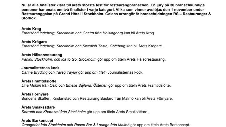 Nu är alla finalister klara till årets största fest för restaurangbranschen. En jury på 30 branschkunniga personer har enats om två finalister i varje kategori. Vilka som vinner avslöjas den 1 november under Restauranggalan 2010 på Grand Hôtel i Stockholm. Galans arrangör är branschtidningen RS – Restauranger & Storkök.