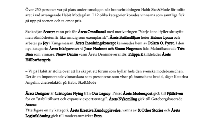 Över 250 personer var på plats under torsdagen när branschtidningen Habit Sko&Mode för tolfte året i rad arrangerade Habit Modegalan. I 12 olika kategorier korades vinnarna som samtliga fick gå upp på scenen och ta emot pris.