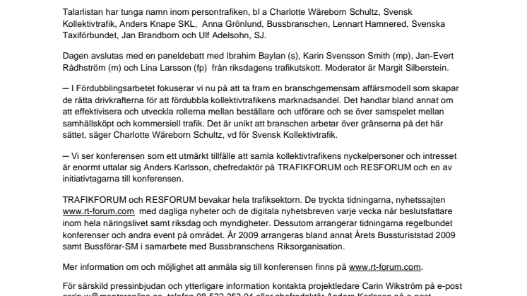 Den 15 april samlas Sveriges ledande aktörer inom kollektivtrafik för att diskutera framtidens resande. Då arrangeras Kollektivtrafikdagen 2009. Bakom konferensdagen står TRAFIKFORUM och RESFORUM, branschens ledande tidningar på området. Våren 2008 startade kollektivtrafikens olika organisationer en partnersamverkan med målsättningen att fördubbla kollektivtrafikens marknadsandel på sikt och att fördubbla resandet till år 2020. Arbetet med att nå denna målsättning pågår med full intensitet. På kollektivtrafikdagen 2009 har man samlat branschens ledare samt företrädare från riksdag och myndigheter för att bl a tala om hur fördubblingsarbetet ska genomföras i praktiken. Talarlistan har tunga namn inom persontrafiken, bl a Charlotte Wäreborn Schultz, Svensk Kollektivtrafik, Anders Knape SKL, Anna Grönlund, Bussbranschen, Lennart Hamnered, Svenska Taxiförbundet, Jan Brandborn och Ulf Adelsohn, SJ. Dagen avslutas med en paneldebatt med Ibrahim Baylan (s), Karin Svensson Smith (mp), Jan-Evert Rådhström (m) och Lina Larsson (fp) från riksdagens trafikutskott. Moderator är Margit Silberstein. ─ I Fördubblingsarbetet fokuserar vi nu på att ta fram en branschgemensam affärsmodell som skapar de rätta drivkrafterna för att fördubbla kollektivtrafikens marknadsandel. Det handlar bland annat om att effektivisera och utveckla rollerna mellan beställare och utförare och se över samspelet mellan samhällsköpt och kommersiell trafik. Det är unikt att branschen arbetar över gränserna på det här sättet, säger Charlotte Wäreborn Schultz, vd för Svensk Kollektivtrafik. ─ Vi ser konferensen som ett utmärkt tillfälle att samla kollektivtrafikens nyckelpersoner och intresset är enormt uttalar sig Anders Karlsson, chefredaktör på TRAFIKFORUM och RESFORUM och en av initiativtagarna till konferensen. TRAFIKFORUM och RESFORUM bevakar hela trafiksektorn. De tryckta tidningarna, nyhetssajten www.rt-forum.com med dagliga nyheter och de digitala nyhetsbreven varje vecka når beslutsfattare inom hela näringslivet samt riksdag och myndigheter. Dessutom arrangerar tidningarna regelbundet konferenser och andra event på området. År 2009 arrangeras bland annat Årets Bussturiststad 2009 samt Bussförar-SM i samarbete med Bussbranschens Riksorganisation. Mer information om och möjlighet att anmäla sig till konferensen finns på www.rt-forum.com. För särskild pressinbjudan och ytterligare information kontakta projektledare Carin Wikström på e-post carin.w@mentoronline.se, telefon 08-522253 04 eller chefredaktör Anders Karlsson på e-post anders.k@mentoronline.se, telefon 070-580 27 49. TRAFIKFORUM är Nordens ledande facktidning för persontrafik: busstrafik, spårtrafik och annan kollektivtrafik som skolskjutsar, sjukresor, färdtjänst osv. Tidningen ges ut månadsvis tillsammans med RESFORUM, som är Nordens ledande branschtidning om bussresor och bussturism. Tidningarna ges ut av Mentor Communications AB. Mentor Communications AB är ett helägt dotterbolag inom Mentor Onlinekoncernen. Mentor Online AB är Skandinaviens ledande leverantör av branschinriktad information mellan företag. Mentor besitter unik kompetens när det gäller att samla in, analysera, värdera, kommentera och sprida kvalificerad branschinformation till beslutsfattare i näringsliv och förvaltning. Informationsspridningen sker genom facktidningar och böcker från eget förlag, events, specialnummer, utbildningssatsningar samt genom en samling vertikala internetportaler under huvudportalen www.mentoronline.se.