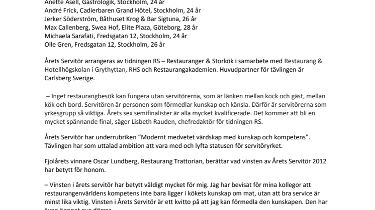 – Inget restaurangbesök kan fungera utan servitörerna, som är länken mellan kock och gäst, mellan kök och bord. Servitören är personen som förmedlar kunskap och känsla. Därför är servitörerna som yrkesgrupp så viktiga. Årets sex semifinalister är alla mycket kvalificerade. Det kommer att bli en mycket spännande final, säger Lisbeth Rauden, chefredaktör för tidningen RS.