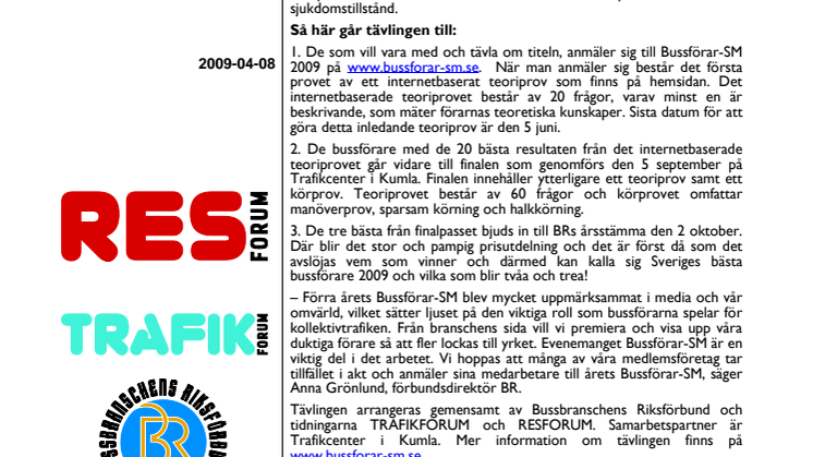Nu har startskottet gått för Bussförar-SM 2009. Vem som tar hem priset i år och kan titulera sig Sveriges bästa bussförare avslöjas den 2 oktober då Svenska Bussbranschens Riksförbund (BR) har sin stora årsstämma.