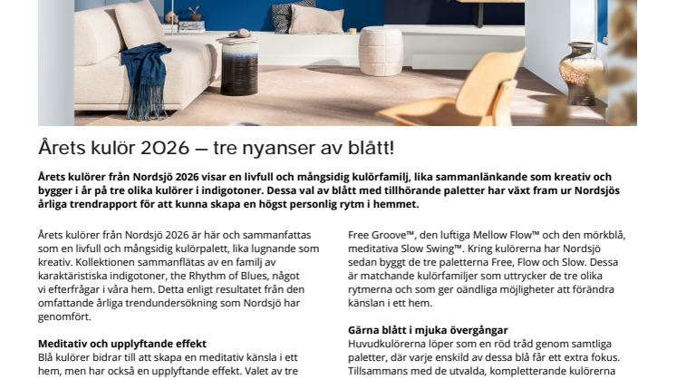 Årets kulörer från Nordsjö 2026 är här och sammanfattas som en livfull och mångsidig kulörpalett, lika lugnande som kreativ. Kollektionen sammanflätas av en familj av karaktäristiska indigotoner, the Rhythm of Blues, något vi efterfrågar i våra hem. Detta enligt resultatet från den omfattande årliga trendundersökning som Nordsjö har genomfört.