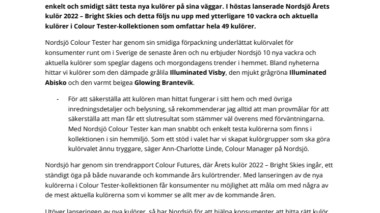 Nordsjö har genom sin trendrapport Colour Futures, där Årets kulör 2022 – Bright Skies ingår, ett ständigt öga på både nuvarande och kommande års kulörtrender. Med lanseringen av de nya kulörerna i Colour Tester-kollektionen får konsumenter nu möjlighet att måla om med några av de mest aktuella kulörerna som vi kommer se allt mer av de kommande åren.