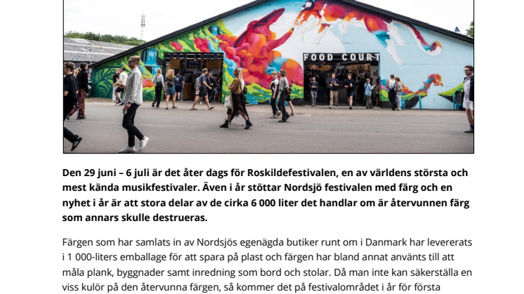 Den 29 juni – 6 juli är det åter dags för Roskildefestivalen, en av världens största och mest kända musikfestivaler. Även i år stöttar Nordsjö festivalen med färg och en nyhet i år är att stora delar av de cirka 6 000 liter det handlar om är återvunnen färg som annars skulle destrueras.