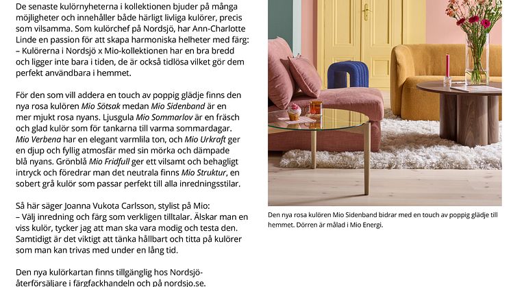 De senaste kulörnyheterna i kollektionen bjuder på många möjligheter och innehåller både härligt livliga kulörer, precis som vilsamma. Som kulörchef på Nordsjö, har Ann-Charlotte Linde en passion för att skapa harmoniska helheter med färg: –Kulörerna i Nordsjö x Mio-kollektionen har en bra bredd och ligger inte bara i tiden, de är också tidlösa vilket gör dem perfekt användbara i hemmet.