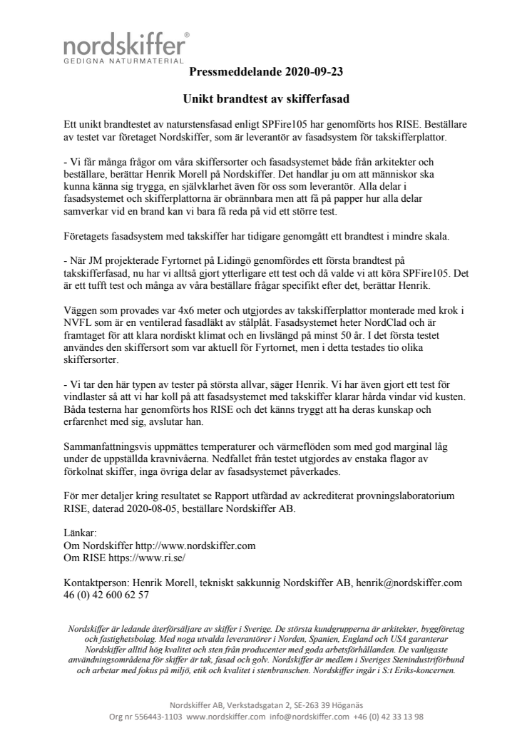 Plattor av tio olika sorters skiffer monterades i fasadsystemet NordClad (NVFL plåtläkt, montage med krok). Fasaden låg under kravnivåerna för temp och värmeflöde med god marginal, fasadsystemet påverkades inte och endast enstaka förkolnade flagor från skiffern lossnade.